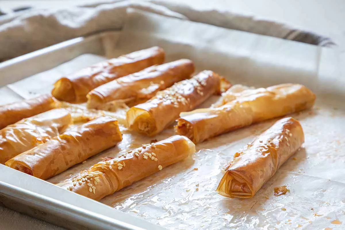 - לשים בקצה כ-1 כפית מהרוטב ועליו חתיכה של מוצרלה, לסגור מהצדדים ולגלגל. להניח בתבנית מרופדת בנייר אפייה.
