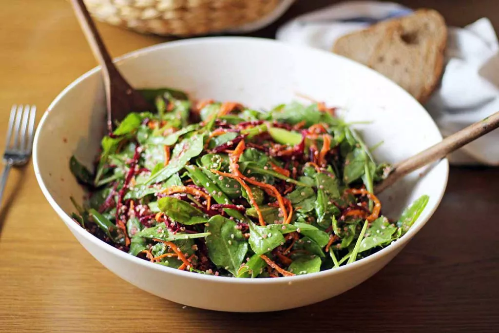 - להוסיף את הקינואה, סלק, בצל ירוק, גבינת פטה מפוררת, אגוזי מלך, שומשום ובטטה מטוגנת.