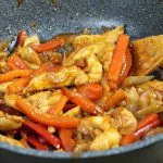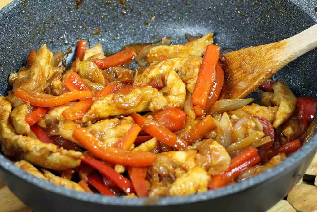 רצועות של חזה עוף עם בצל ופלפלים מטוגנים ברוטב אדום.