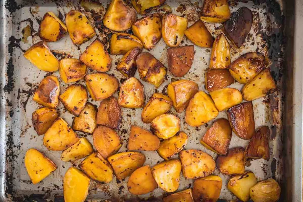 - בינתיים להגביר את הטמפרטורה של התנור ל-220 מעלות ולהחזיר את תפוחי-האדמה לתנור עד שהם מקבלים השחמה יפה (במידה ותפוחי-האדמה לא שחומים).