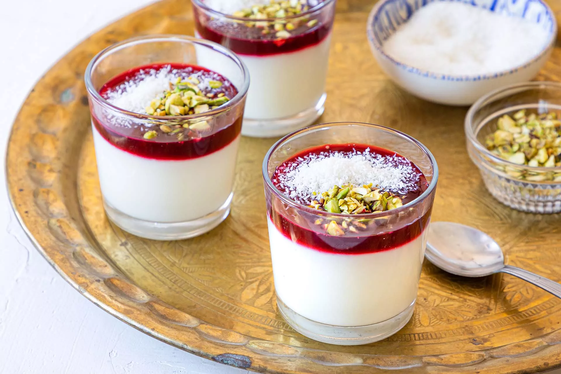 - בהגשה למזוג סירופ אדום על כל כוס מלבי ולפזר מעט פיסטוקים וקוקוס.