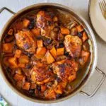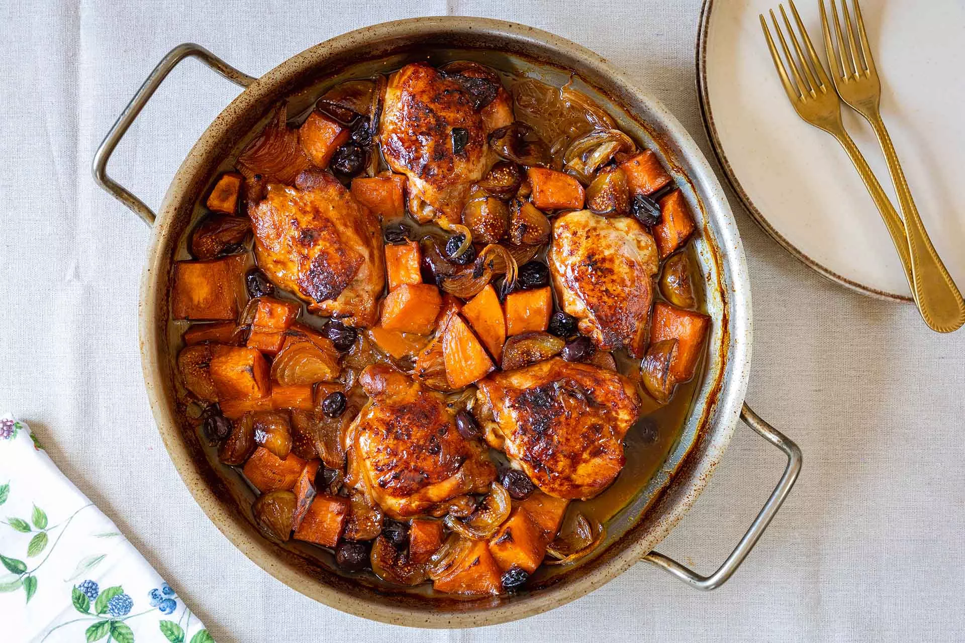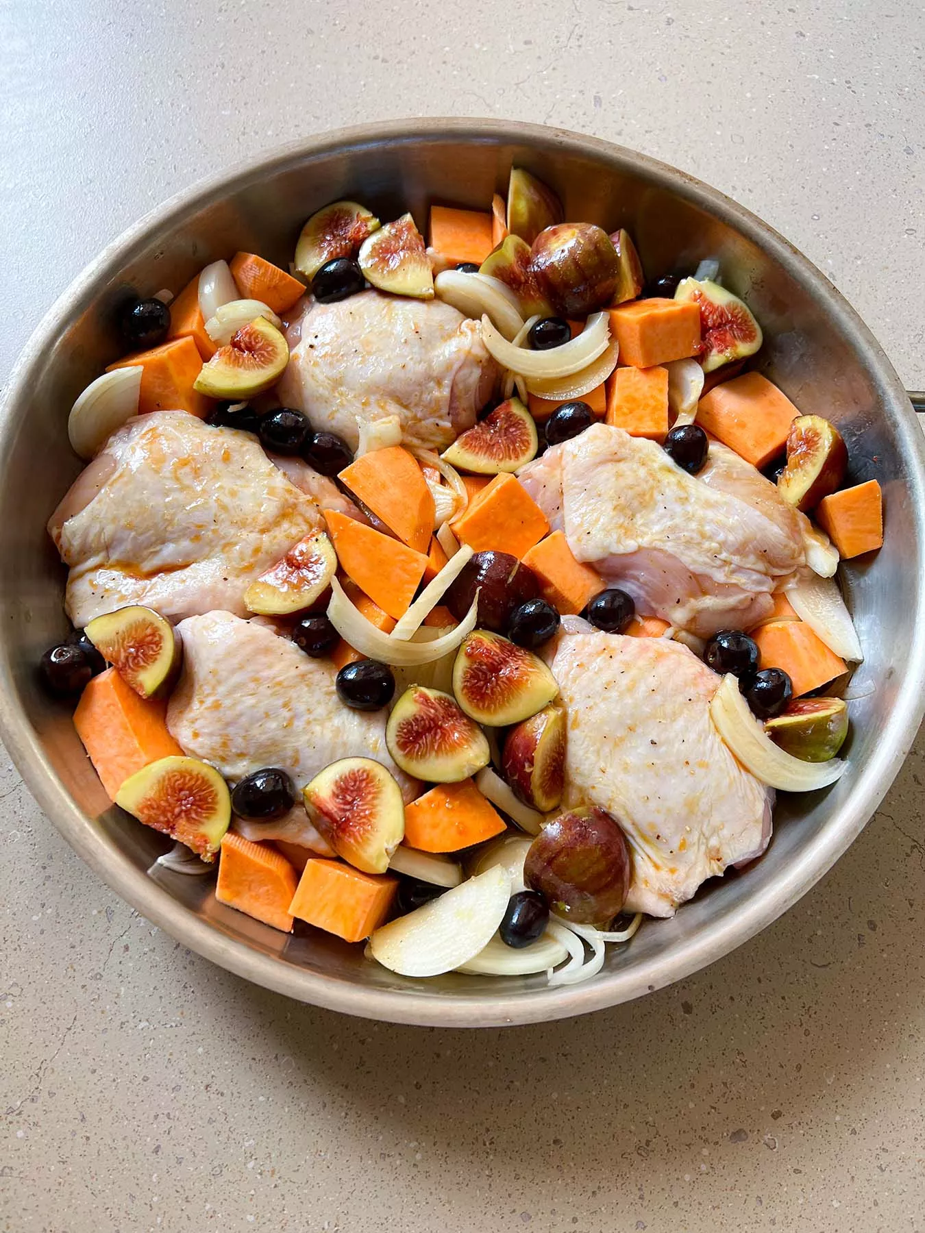 - להניח בסיר או מגש שמתאים לתנור, את פרוסות הבצל, קוביות הבטטה, לערבב מעט. לסדר את חתיכות העוף בין הירקות כשהעור כלפי מעלה. לפזר מעל את התאנים והענבים ולשפוך את הרוטב.