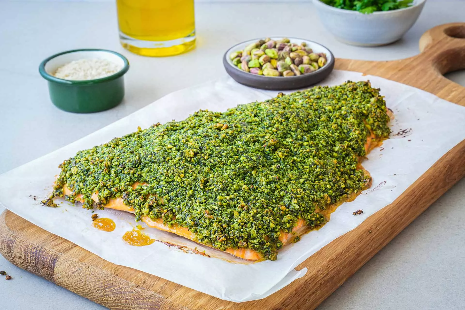 נתח עסיסי של סלמון עם ציפוי ירוק בוהק קרנצ'י טעים, כמו פסטו על בסיס כוסברה ופיסטוקים שמוסיפים לו פירורי לחם.
