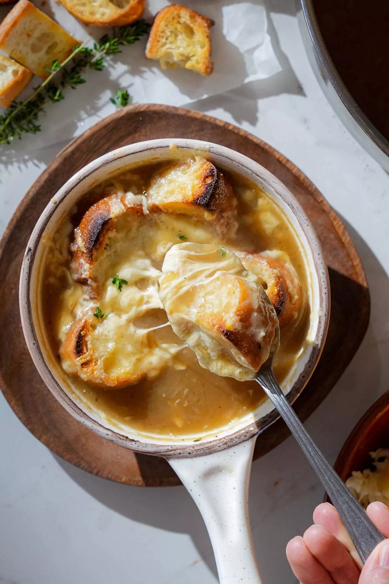 מרק בצל צרפתי חלומי עם בצלים נמסים בפה שעוברים טיגון ארוך בחמאה עד שהם מתקרמלים ומקבלים צבע שחום יפייפה.