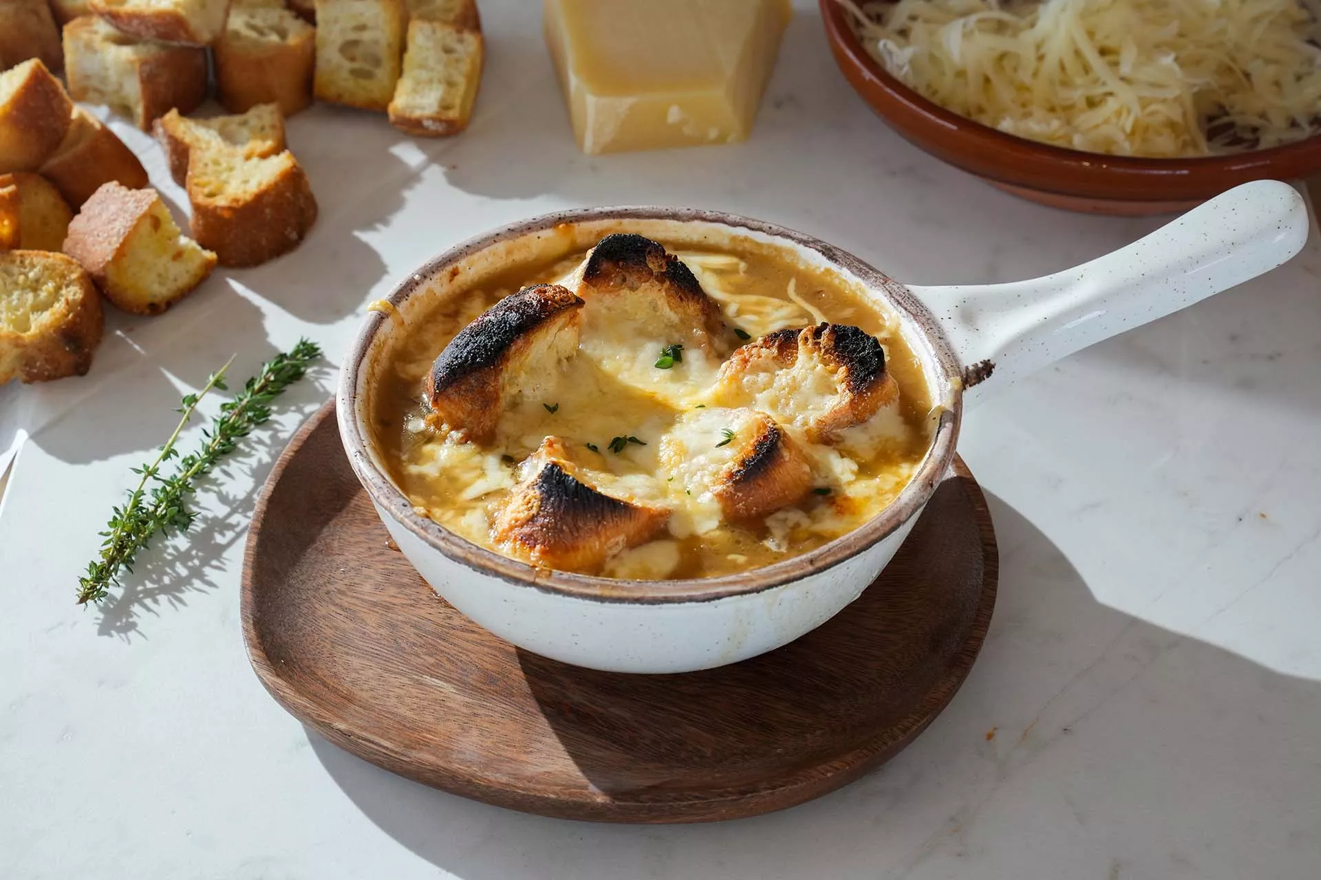 - לחלק את המרק לקערות שמתאימות לתנור. לפזר מעט מהגבינות מעל המרק, להניח בעדינות כמה חתיכות של קוביות ג'בטה. לפזר מעל הקוביות גבינות. להניח את קערות המרק על תבנית אפייה ולהכניס לתנור לצלייה של כמה דקות עד שהגבינות נמסות, מבעבעות ומקבלות מעט הזהבה. להוציא ולהגיש מיד.