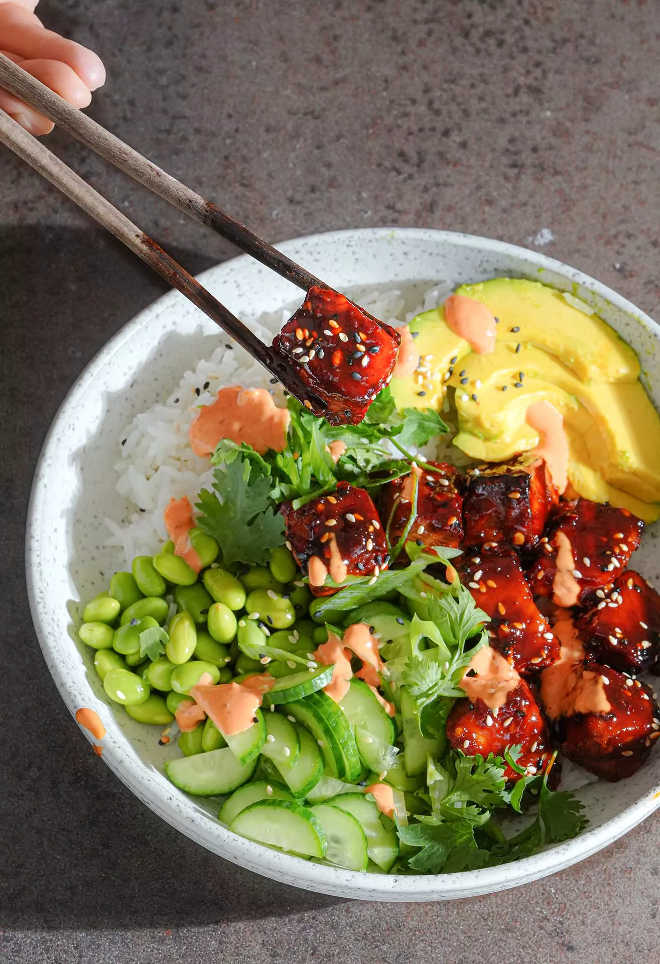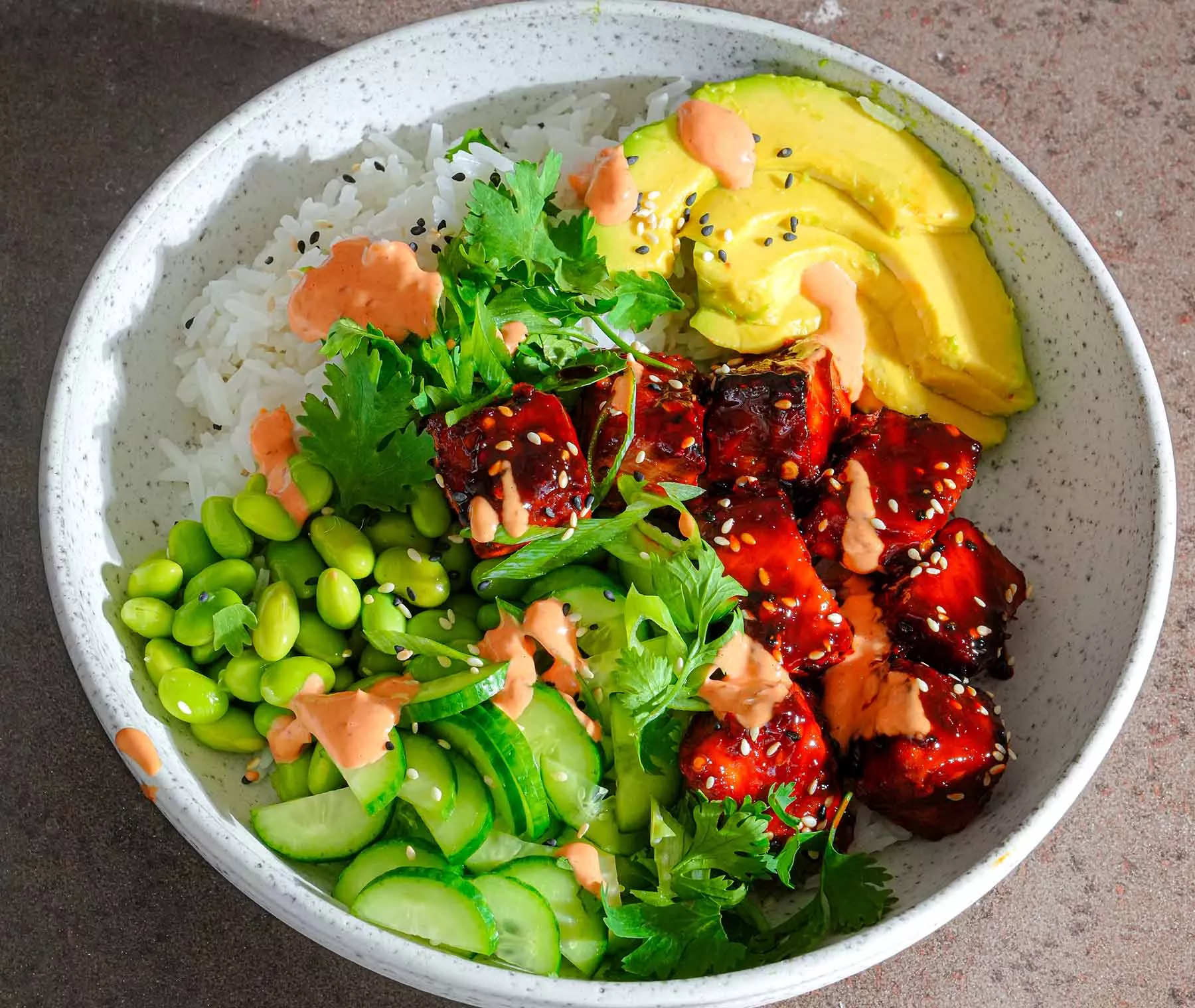 - להגשה- להניח בקערה אישית אורז, מלפפון, אדממה, קוביות סלמון, אבוקדו, כוסברה ובצל ירוק. לפזר מעט שומשום לבן קלוי ושומשום שחור ולזלף מעט מהרוטב מיונז-אריסה.