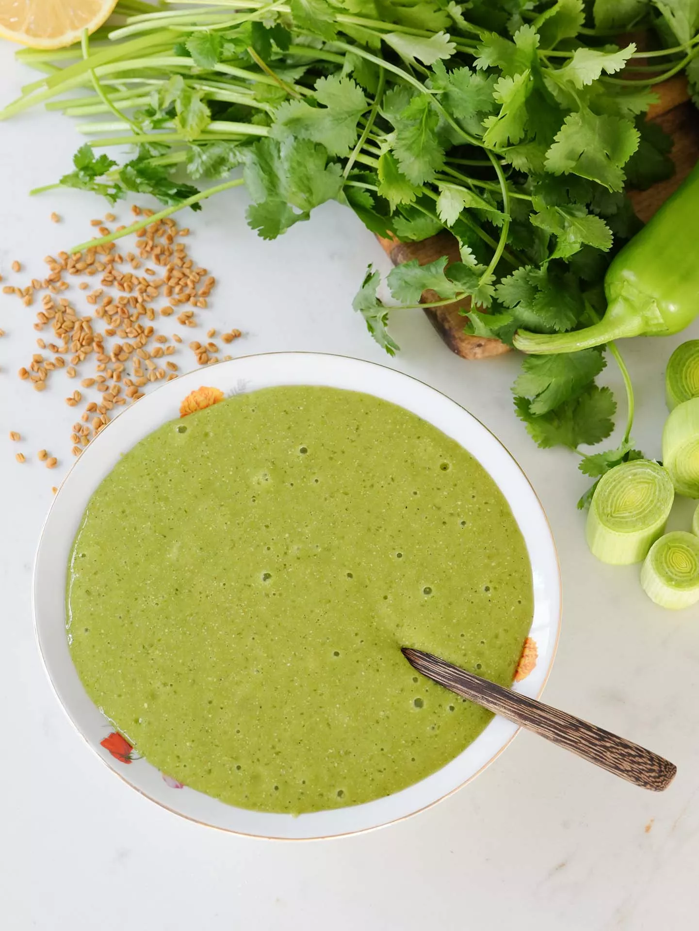 - להניח את הפלפלים החריפים בבלנד, להוסיף כוסברה, פלפל שחור, כמון, הל, צ'ילי, שום, מלח, שמן זית ומים. לטחון למרקם חלק.