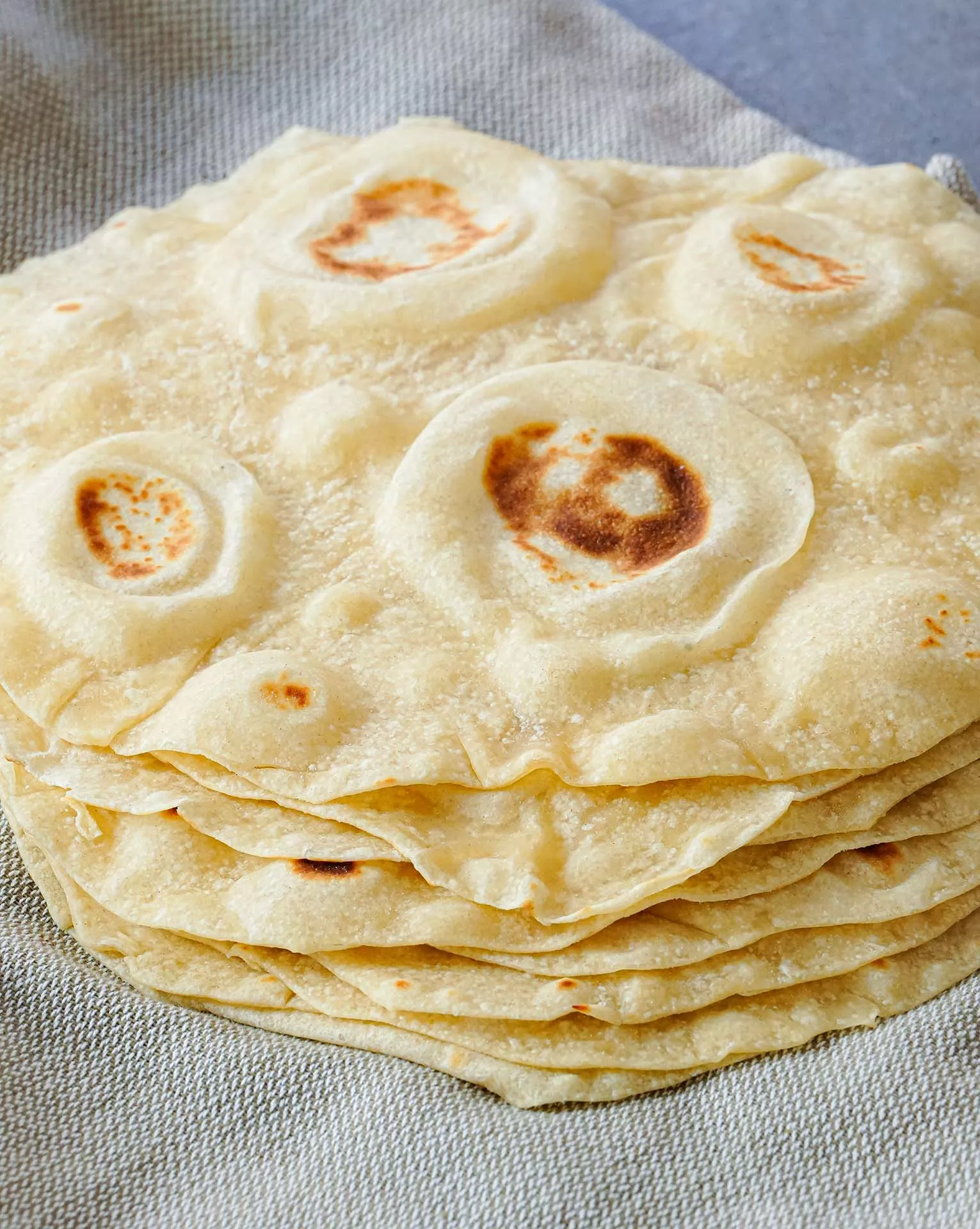 - לחמם מחבת על אש בינונית-גבוהה. להניח את הטורטייה על המחבת, ברגע שמתחילות להופיע בועות, כעבור חצי דקה-דקה, להפוך את הטורטייה ולבשל עוד חצי דקה-דקה. להוציא לצלחת ולכסות ישר בשקית או במגבת כדי שלא יתייבשו. להכין כך את כל הטורטיות. להגיש מיד.