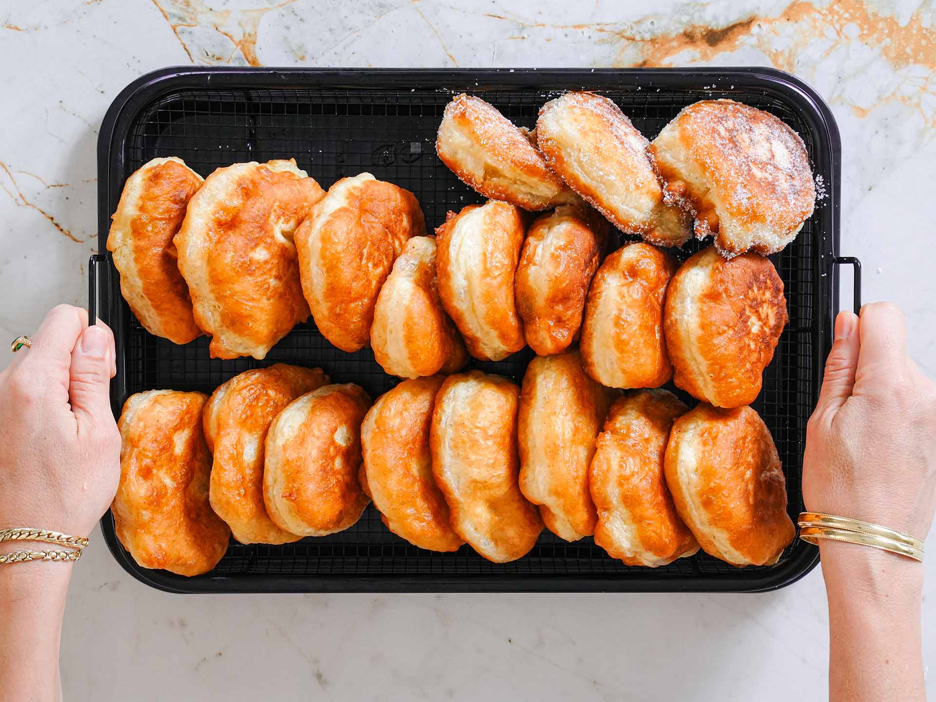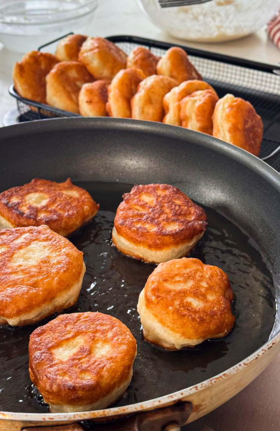 - עם ידיים רטובות לקחת חתיכות בצק, לשטח מעט ולהניח בעדינות בשמן החם. לטגן עד השחמה מצג אחד, להפוך ולטגן עד השחמה מצד שני. להוציא לרשת צינון.