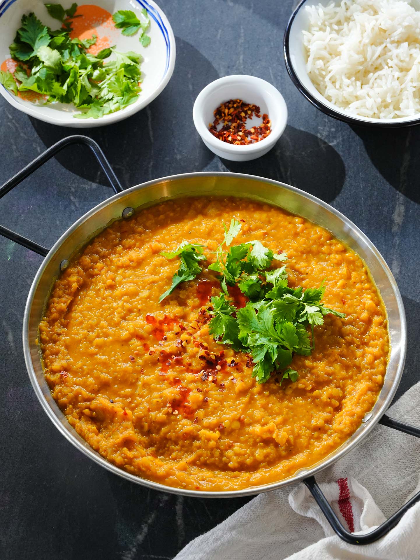 תבשיל דאל קלאסי מעדשים כתומות, שמתבשלות יחד עם עגבניות ושפע תבלינים עד שהן מתפרקות לחלוטין והופכות לתבשיל סמיך,